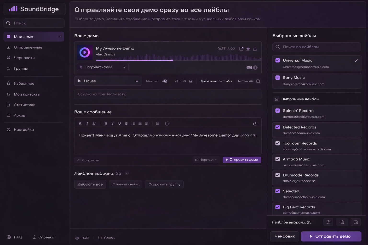 SoundBridge помогает артистам рассылать демо быстро, аккуратно и без хаоса в почте. Загружайте трек, собирайте медиакит, выбирайте лейблы по жанру и отправляйте персонализированные письма сразу в нужные A&R-инбоксы — с отслеживанием статуса и ответов в одном месте.